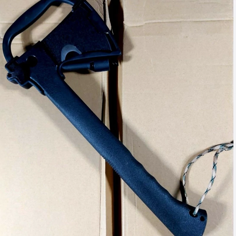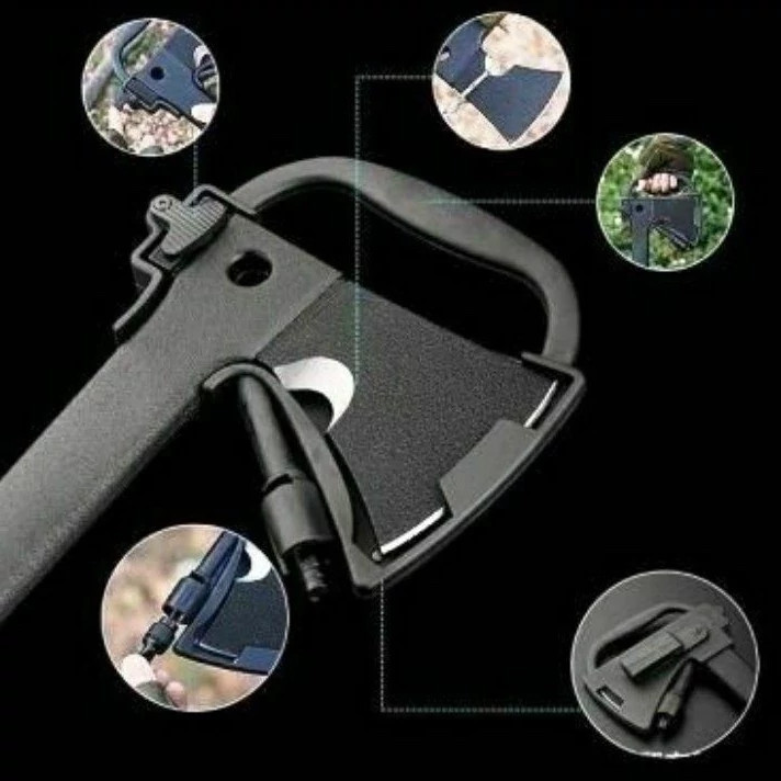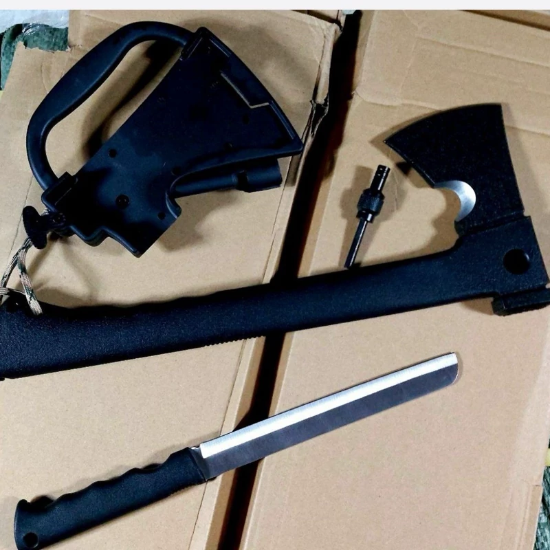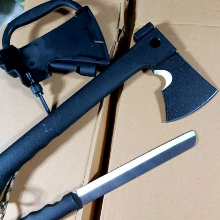 مواد تیغه: فولاد 7CR17MOV طول کامل: 36.5 سانتی متر طول تیغه: 7.8 سانتی متر عرض تبر: 14.5 سانتی متر طول دستگیره: 28.5 سانتی متر وزن: 843 گرم دارای کارد ، سوت ، چخماق ، طناب بر ، چکش دارای غلاف پلاستیک فشرده با کیفیت نوع کاربری: آفرود ، طبیعتگردی ، کمپینگ ، کوه نوردی دارای چندین ابزار مختلف از جمله: چاقو سفری ، تسمه بر و همین طور آتش زنه را در اختیار شما قرار می دهد. هر کدام کیفیت بالایی داشته و می توانند در شرایط ضروری به کمک شما بیایند. همانطور که از تصاویر این محصول نیز پیداست چاقو سفری این محصول بصورت مخفی در داخل دسته تبر تعبیه شده که به راحتی با باز کردن درب انتهای دسته می توانید به آن دسترسی داشته باشید.