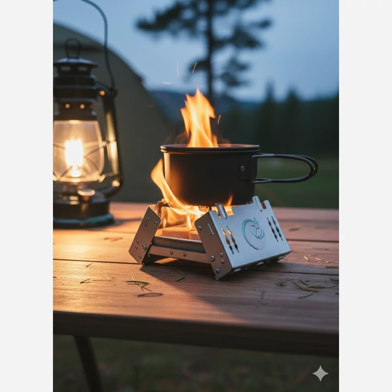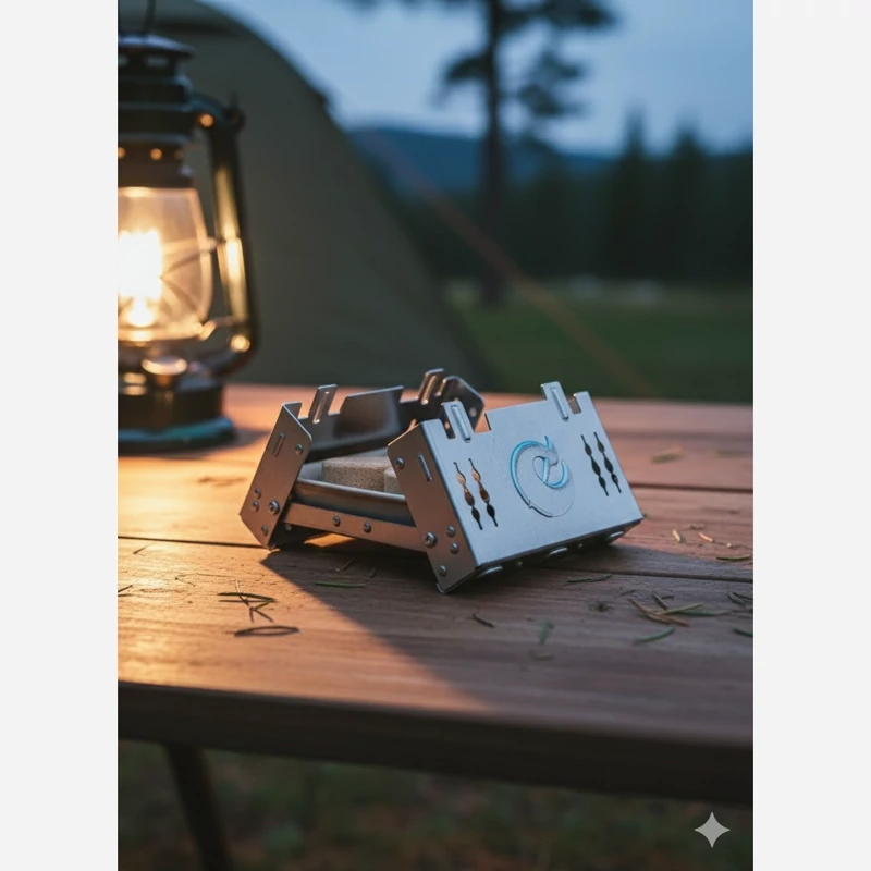 اجاق تاشوی فلزی مناسب کمپ، طبیعتگردی و سفر، همراه با چند عدد قرص سوخت جامد. سبک، کمحجم، بادوام و قابلاستفاده برای جوش آوردن آب، گرمکردن غذا و تهیه چای در محیط باز.